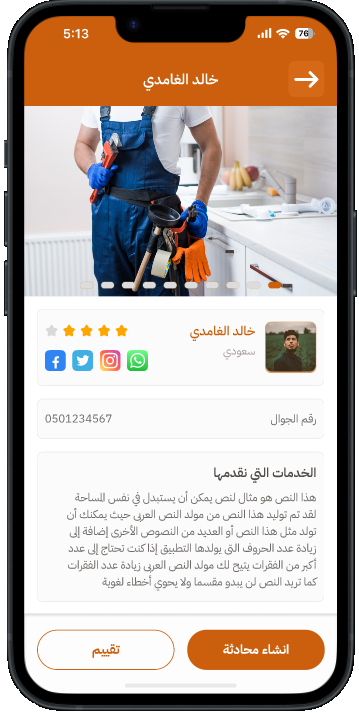 تواصل مع مقدمي الخدمة بسهولة عبر الدردشة النصية، أو من خلال الجوال والواتساب المضاف في الملف الشخصي.